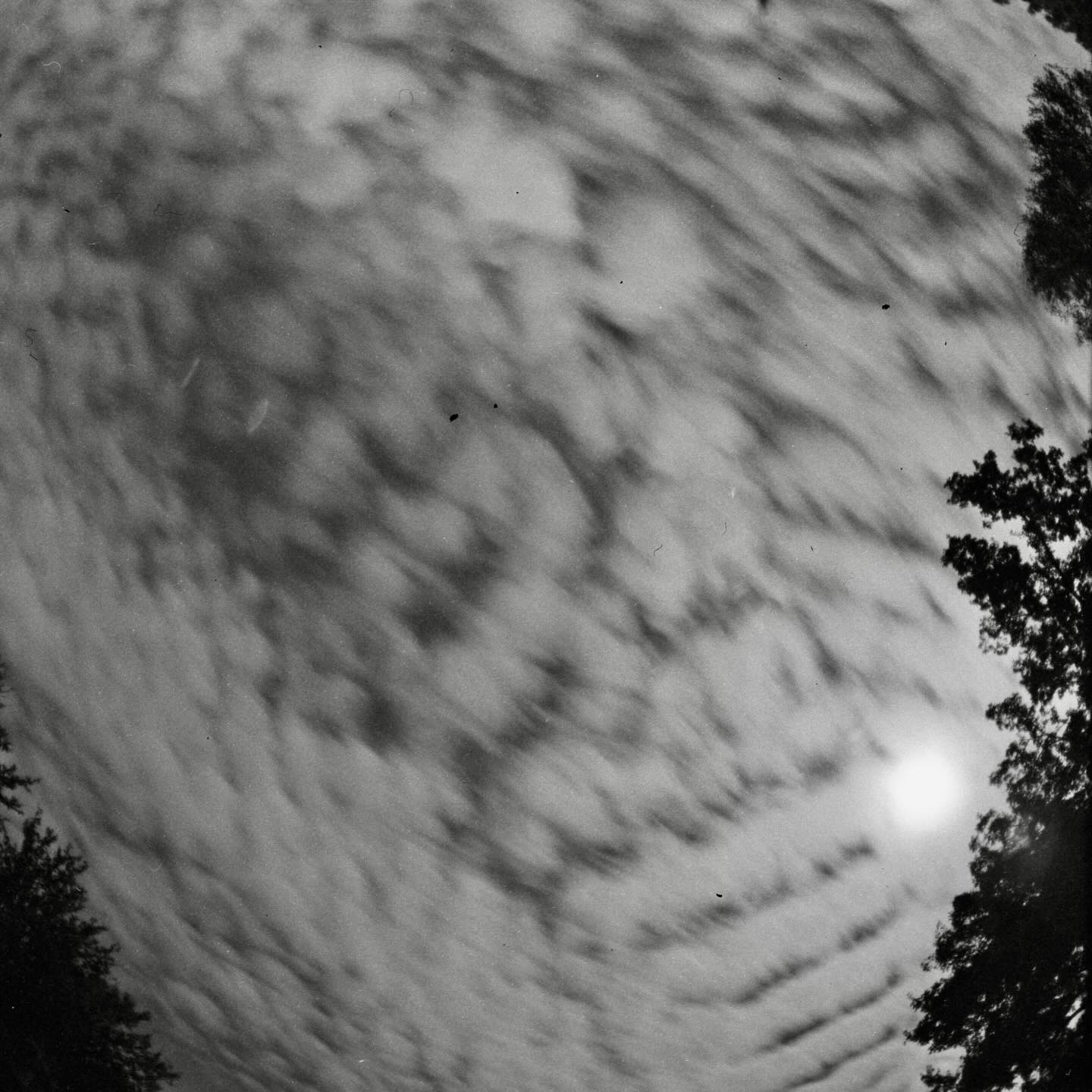 ~1935 Kochmann Reflex-Korelle with an adapted 30 mm f3.5 Zodiak-8 fisheye lens, pointed straight up, during full moon. I have slightly underestimated the amount of movement of things in the sky. On the other hand, I didn’t really have the choice to do shorter exposures anyway. This one was about three minutes. On Fomapan 400.